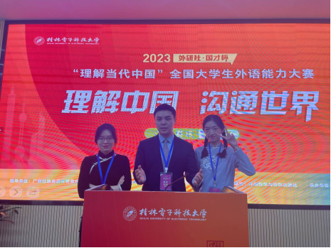 近日 “外研社·国才杯”“理解当代中国”全国大学生外语能力大赛广西赛区选拔赛落下帷幕。本次比赛由自治区教育厅指导,广西壮族自治区本科高校英语类教学指导委员会主办,大赛分为演讲、口译、笔译、写作、阅读等多种形式,充分考查了同学们的英语应用能力。凭借赛前的精心准备和临场良好发挥,我校刘俊庭同学以排名第二的优异成绩斩获广西壮族自治区演讲大赛金奖,入围全国总决赛;何玥同学以排名第四的优异成绩斩获广西壮族自治区英语写作大赛金奖,并入围全国总决赛。其余选手分别荣获写作大赛银奖1名、铜奖2名;阅读大赛银奖1名、铜奖3名;笔译大赛银奖1名、铜奖1名;演讲比赛银奖2名。