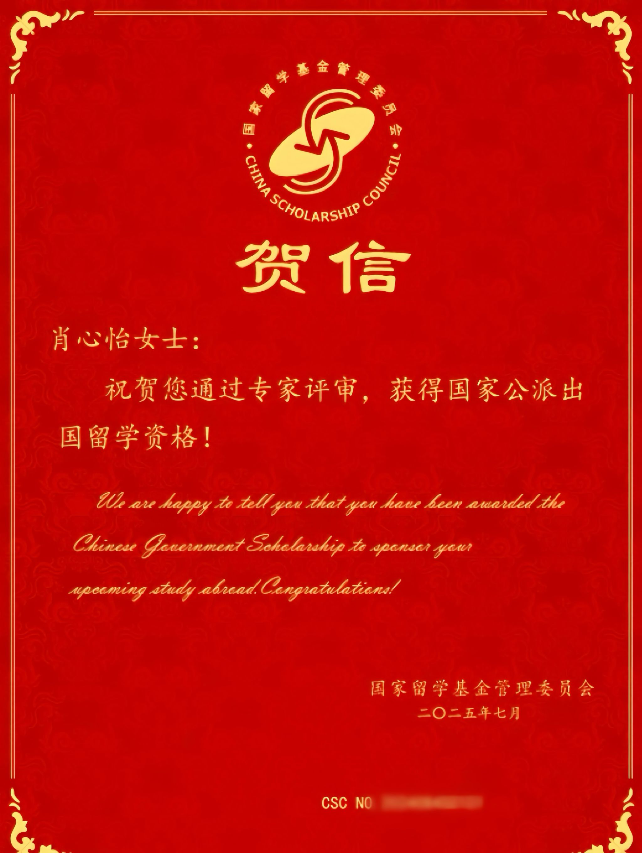 近日,国家留学基金管理委员会(以下简称国家留学基金委)公布了2025年秋季国家公派留学项目录取结果。我院2021级商务英语专业学生肖心怡获国家公派留学资格,被匈牙利eötvös loránd university(厄特沃什・罗兰大学)硕士项目录取,留学期间将享受国家留学基金委提供的奖学金资助。