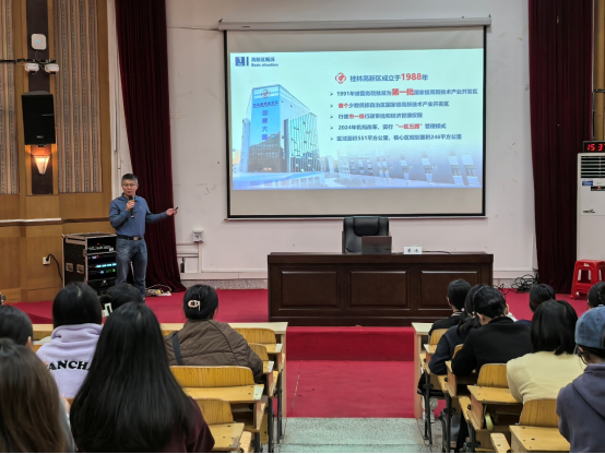 董冰局长长期致力于推动科技创新与产业融合,对桂林高新区在电子信息、生物医药、高端制造等领域的布局规划、企业发展、人才需求有着全面深入的了解。通过详细的产业分布与企业发展情况介绍,他为同学们解读了桂林本地的产业机遇,更点拨了提升个人职业核心竞争力的方向。本次讲座是一次难得的接触行业前沿、链接优质资源的机会,不仅增进同学们对地区经济发展的了解,也拓宽了同学们对我国对外开放格局的认识和国际视野。