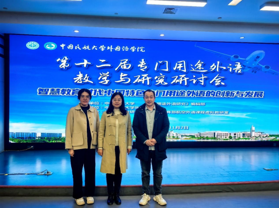 近日,全国第十二届专门用途外语教学与研究研讨会在天津召开。本次会议 由中国民航大学、《专门用途外语研究》编辑部主办,外语教学与研究出版社、 教育部航空外语课程虚拟教研室协办。会议主题为“智慧教育时代中国特色专门 用途外语的创新与发展”,旨在进一步推动人工智能与专门用途外语教育深度融 合,推动数智化转型,探索专门用途外语教育的中国智慧和中国方案。外语外贸 学院副院长赵振华,大学英语教研室李响林、文琰老师参加此次会议。