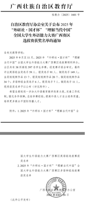 在2025年“外研社·国才杯”“理解当代中国”全国大学生外语能力大赛中,我校学生表现优异,共荣获国家级铜奖2项,省级金奖1项、银奖5项、铜奖7项,创下我校在该赛事中的历史最好成绩。