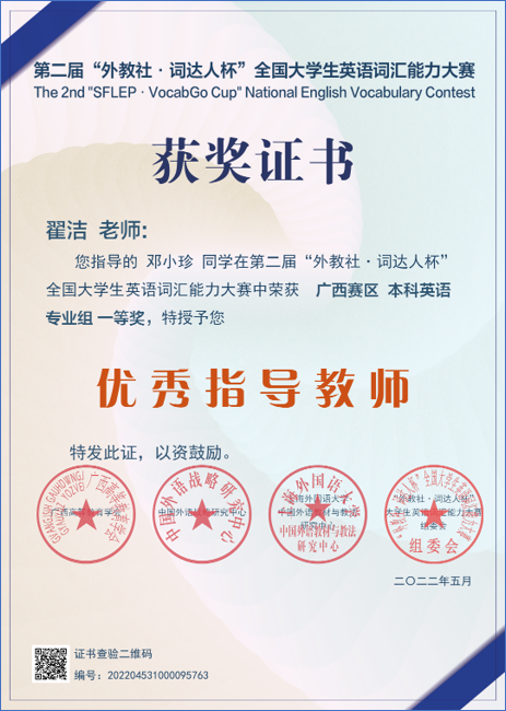 2022年全国大学英语词汇能力大赛优秀指导老师