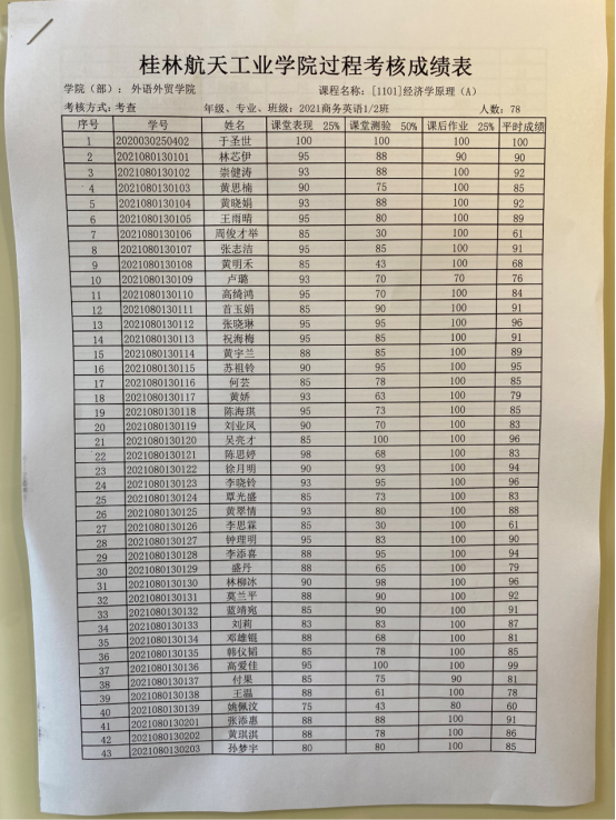 【1101】经济学原理(A)李海红老师所带班级平时成绩公示