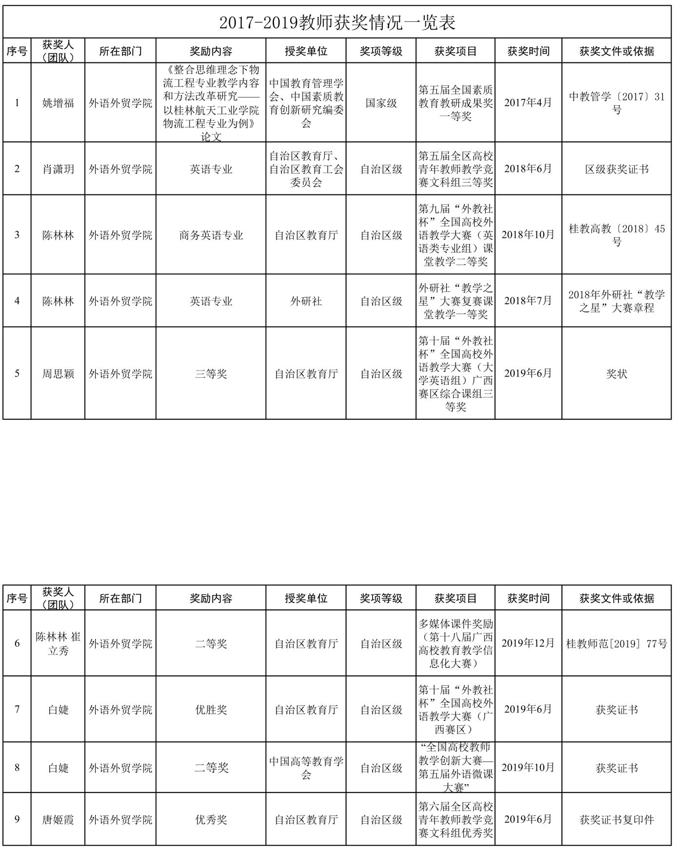 2017—2019教师获奖情况一览表