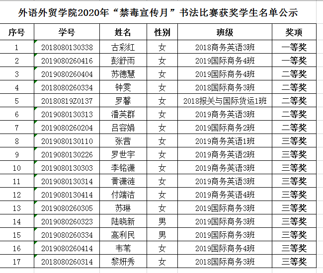 为落实学校“禁毒宣传月”活动要求,进一步加深同学们对毒品知识的了解,学院组织了以“珍爱生命,远离毒品”为主题的书法比赛,共收到参赛作品共50余幅,共评选出一等奖2名,二等奖5名,三等奖10名。