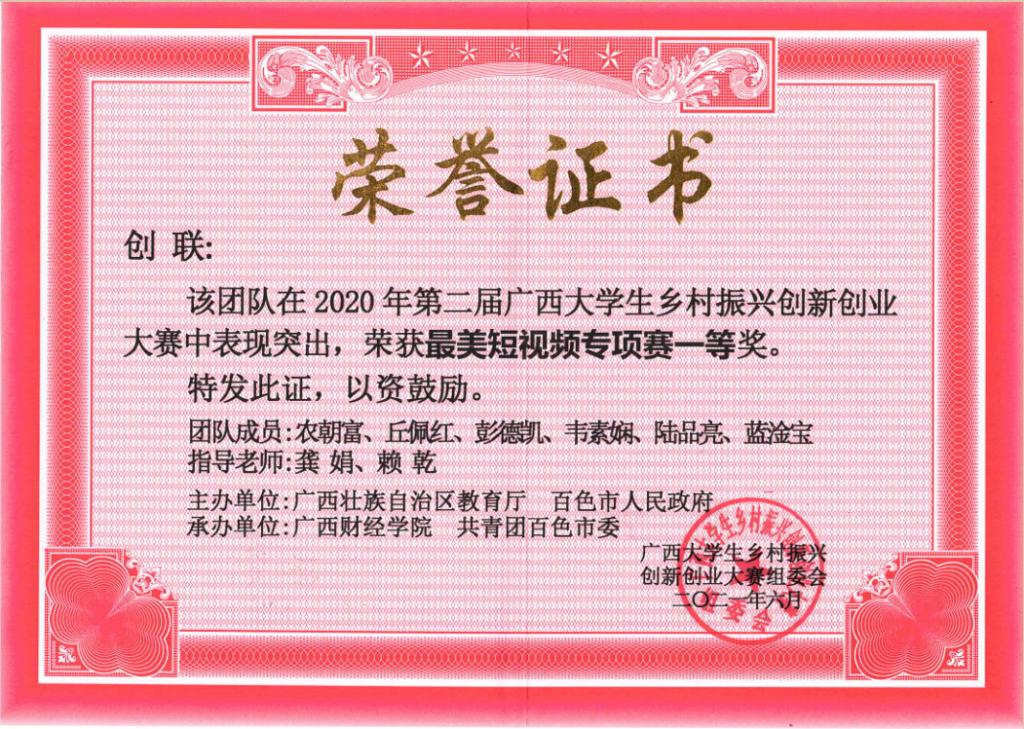 本次大赛为期两个多月,由我院龚娟老师指导的2018级国际商务专业学子农朝富、丘佩红、韦素娴、蓝淦宝组成的参赛队创联小组的抖音短视频《寻觅百色深林蜜源,这才是大自然的馈赠》经过激烈的角逐,荣获第二届广西大学生乡村振兴大赛专项赛道“最美百色”短视频一等奖。