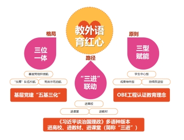 支部将依托“基层党组织领航”,推动“‘头雁’队伍引航”,带动“党员示范启航”形成“三位一体”的组织格局,在OBE工程认证教育理念指导下,把“学生中心型”“成果导向型”“持续改进型”的基本原则贯彻到“党建+业务”的国家级样板支部建设中,全面实施《习近平谈治国理政》多语种版本“进高校、进教材、进课堂”(简称“三进”)的外语类育人路径,最终实现“教外语育红心”的教学型、外宣型特色党建目标(见图2)。